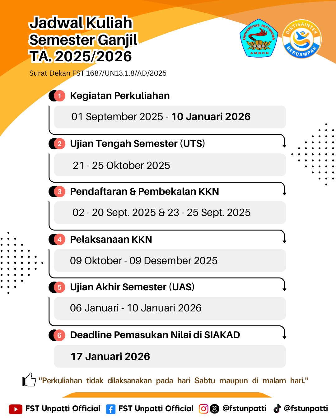 Perkuliahan akan berlangsung mulai 1 September 2025 hingga 10 Januari 2026, dan selama semester ini seluruh mahasiswa diharapkan dapat mengikuti proses pembelajaran secara aktif, disiplin, dan teratur sesuai jadwal yang telah ditetapkan. FST juga menegaskan bahwa perkuliahan tidak dilaksanakan pada hari Sabtu maupun malam hari.